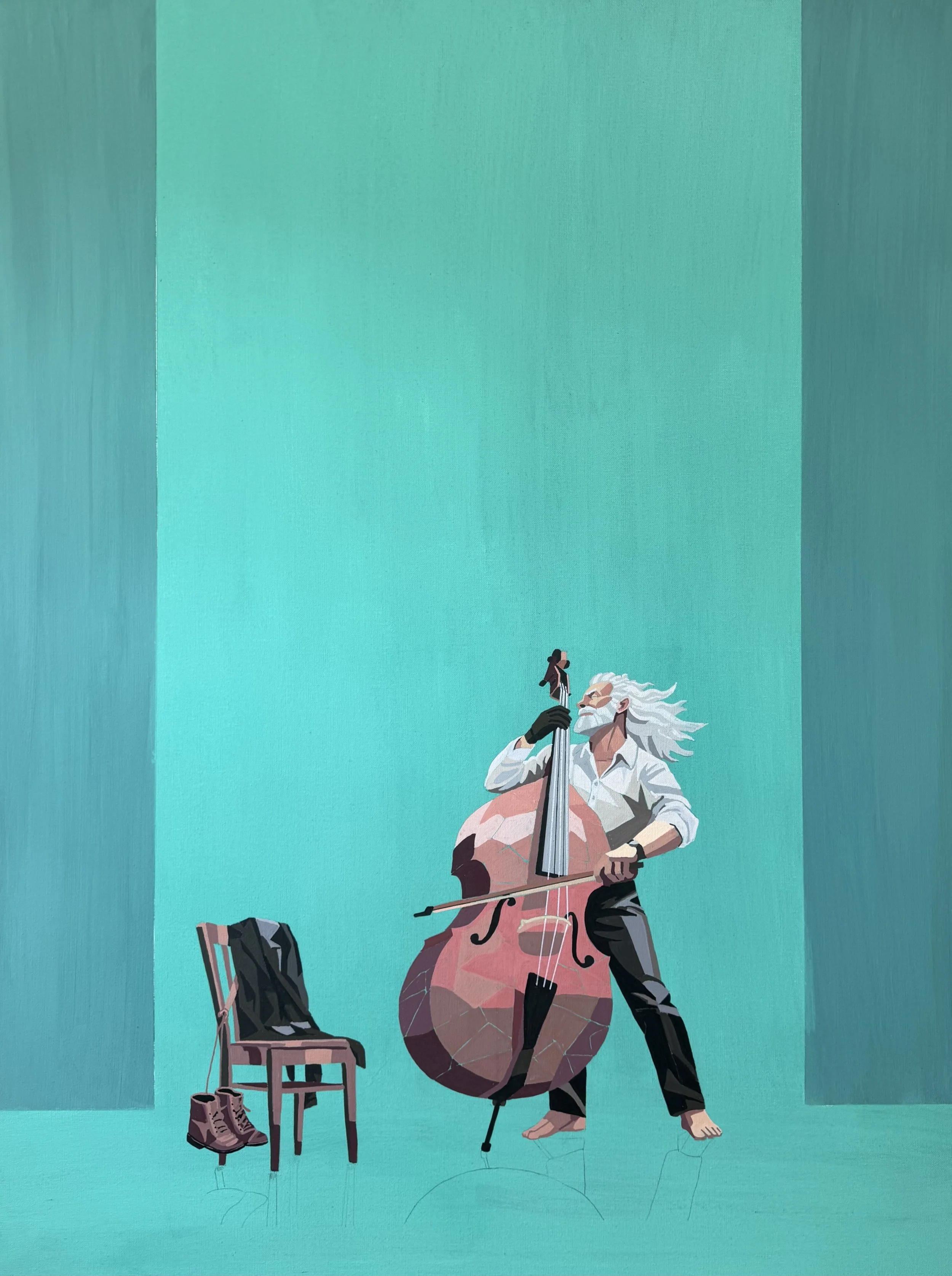 When I painted him, I let the planes gather tightly around his body. The structure feels denser. Less air. He stands grounded, almost braced, but fully present.